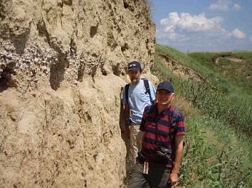 (Photo Left): Nino Seghedi (front) and Alex Szakacs on distal (reworked) fall 40 km from Ciomadul volcano
